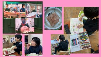 給食時間の様子です。コロナ禍で友達や先生との会話も難しいですが,リモートを繋いで,大きな口でしっかり食べている様子や,同じタイミングで同じものを食べたり楽しい時間でした。隣の教室では色塗り隊のメンバーが給食カレンダーの塗り絵をしていました。