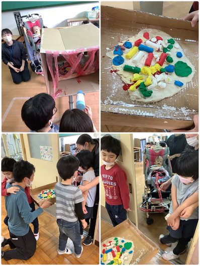 友達と協力して,依頼されたピザを作りました。生地を伸ばし,トッピングをして,窯で焼いて,とても美味しそうなピザが出来上がりました。
