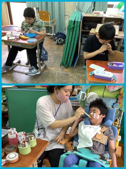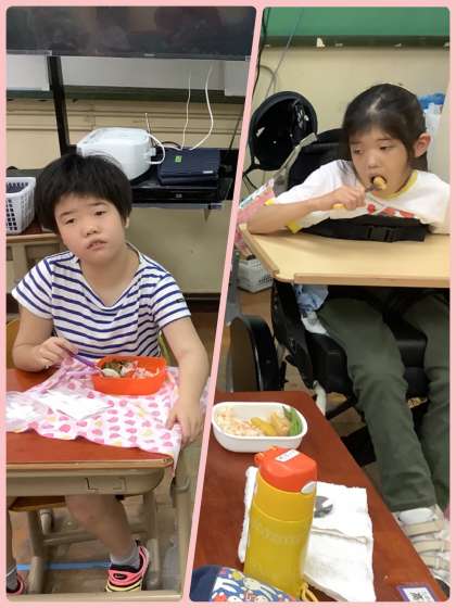 今日は,小学部5年生の校外学習の予定でしたが,雨のため延期になりました。でも,お昼はみんなでお弁当。みんな美味しそうに食べていました。