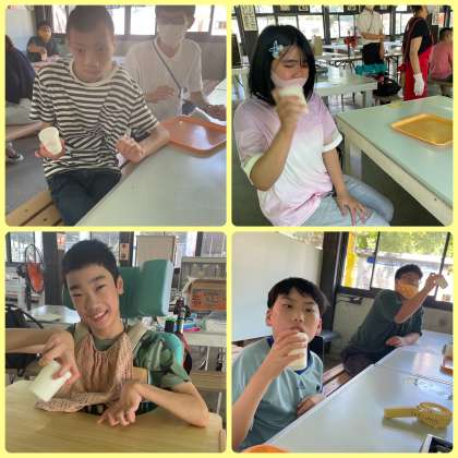 生クリーム2 牛乳1を入れたカップを振ってバターを作りました。みんな一生懸命カップを振りました。振ることでバターと低脂肪乳に分離します。