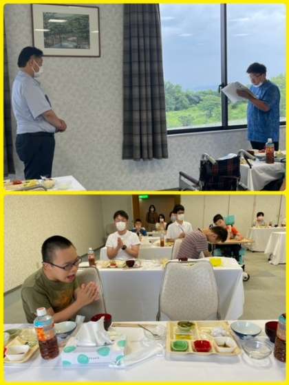 朝食前に退館式を行いました。御礼と感謝の気持ちを込めて手作りのプレゼントを渡しました。