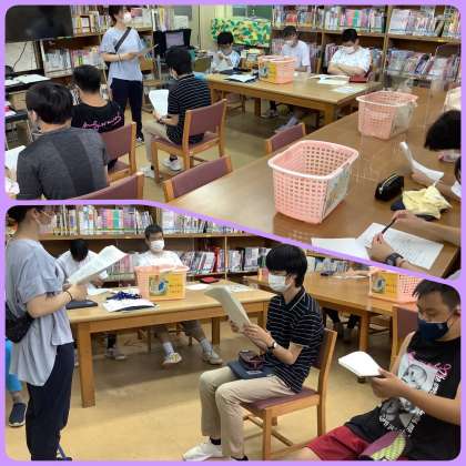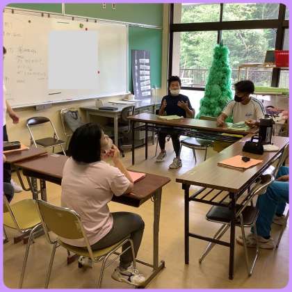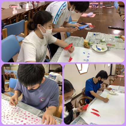 生徒会本部は、リーダースミーティングの活動内容について相談し,意見を交換していました。給食委員会は、お昼の校内放送の背景となる模造紙に夏野菜でスタンプしていました。図書委員会は、動画撮影の役割を確認していました。