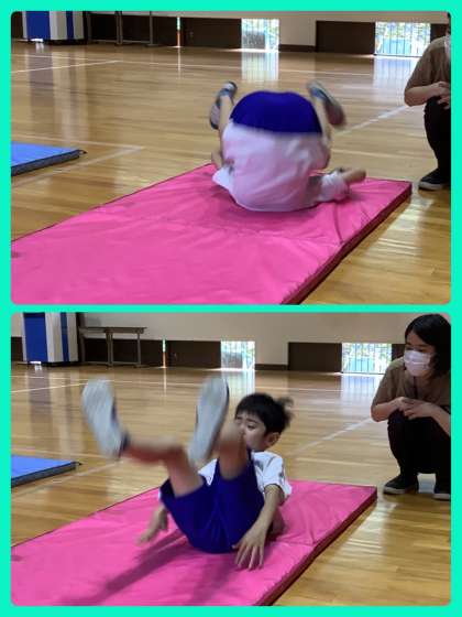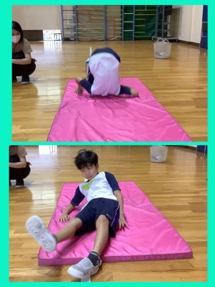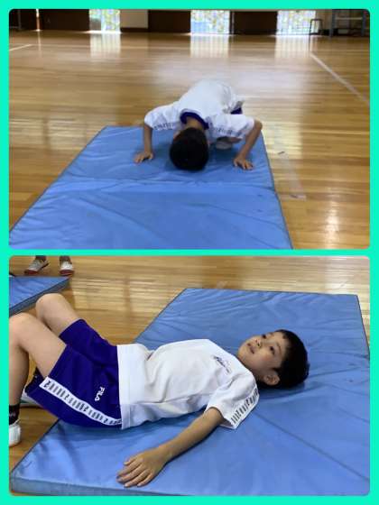 雨天で野山歩行が中止になったので,体育館で身体を動かしました。マット運動では前転の練習を頑張っていました。