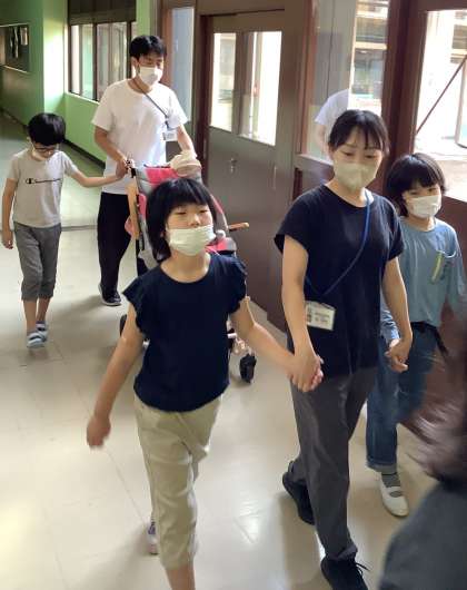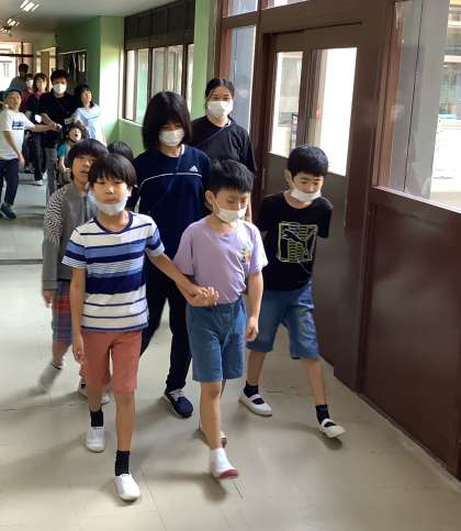 前日からの雨により「土砂災害警戒情報」が発表され、土砂災害発生の危険が高まった想定で、安全な北校舎に避難しました。子どもたちは落ち着いて、安全に避難することができました。