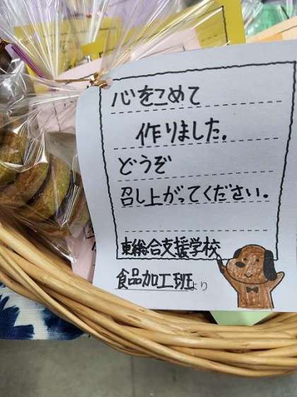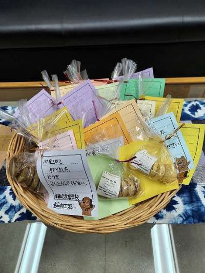 本日、山科醍醐支部中学校の校長会が本校で開催されました。食品加工班の皆さんが一生懸命作ったクッキーをコーヒーとともにお出ししました。コロナ禍前はコーヒーサービスの実践もしていましたが、今は直接渡すことができないので、メッセージカードを作成し、心のこもったおもてなしをしたところ、校長先生からは「チーズやペッパーが入ってとてもおいしい」と感想をいただきました。