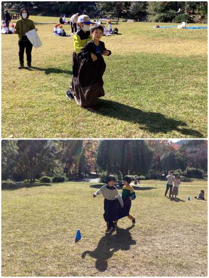 「みんなあそび」では、デカスカリレーをして楽しみました。広い芝生広場で、友だちと一緒に大きなスカートに入って走りました。その後、ボールやシャボン玉などをしました。