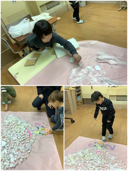 スポンジや緩衝材をたくさん貼って、来年の干支を作りました。「2023」の数字もみんなで作りました。来年も良い年になるように願いを込めて、南校舎の玄関に掲示してありますので、来校の際にはぜひご覧ください。