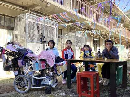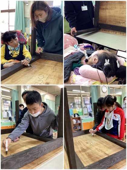 中学部1年生が中庭を憩いの場に作り替えようと取り組んできた計画も1年が経ちました。中庭の雑草を抜いたり、イスに色を付けてカラフルにしたり、空にたくさんのヒモを飾って楽しく造形したりして少しずつ変化させてきました。そして、今日、みんなで作った机を中庭に設置しました。天板の裏にみんなのサインを入れて、中庭改造計画の完成です。素敵な青空の下でみんなで座ってみました。とても気持ちがいいので、みんなに使ってほしいと思います。