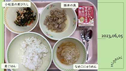 「豚丼」は、今から90年くらい前に北海道十勝地方で生まれた郷土料理です。豚肉に甘辛いタレをからめて焼き、ごはんにのせて丼にしたものです。給食の豚丼は、さとう、料理酒、みりん、しょうゆ、みそを合わせてタレを作りました。調理法は、焼かずに炒めています。肉を炒める時に、しょうが、にんにくを加えて香りをつけ、たまねぎもたっぷり入れました。
