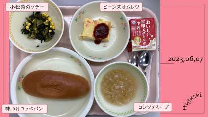 今日の給食は、ビーンズオムレツです。「ビーン」は英語で「豆」という意味で、今日は大豆を使っています。手作りのソースをかけて食べましょう。
