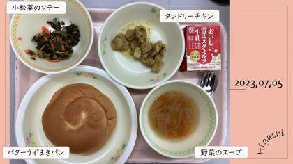 鶏肉をヨーグルトと香辛料につけこみ、タンドールと呼ぶつぼ型のかまどで焼いた料理です。給食のタンドリーチキンは、鶏肉をヨーグルト、カレー粉、トマトケチャップ、しょうゆにつけこみ、オーブンで焼きました。ヨーグルトにつけこむことで、肉がしっとりとして柔らかくなります。カレー粉のピリ辛が食欲を出してくれます。暑い夏にぴったりの献立ですね。