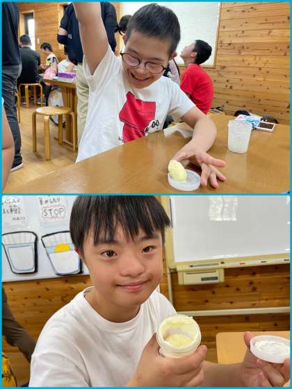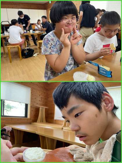 午後からは愛知牧場でバター作り体験です。係の人からしっかりと話を聞いて、実践です。材料の入った瓶をしっかりと振って、バターを作ります。思った以上の時間と力がかかりましたが、その後の試食で美味しくいただけました。
