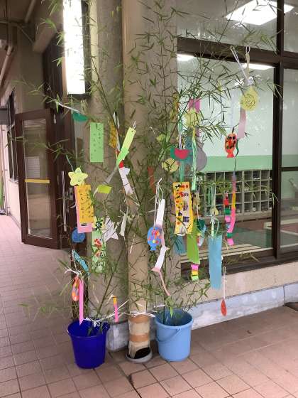 校舎の玄関に立てられた笹が、たくさんの飾りや短冊で飾られました。