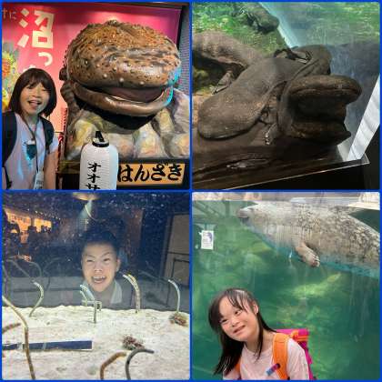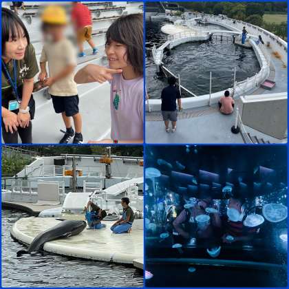 オオサンショウウオの大きさに驚いたり、ずっと寝ているアザラシや面白い生き物をじっと観察したりしている姿が見られました。残念ながら「イルカのあそぶじかん」がイルカの体調不良で中止となってしまいましたが、イルカの健康診断の様子やジャンプの練習を見ることができみんな大喜びでした。また、「なんで中止なんですか?」と係の方に質問することもできました。