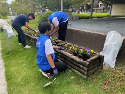 地域実践の生徒2名が、地域に貢献できる活動を通して働くための基礎基本的な姿勢を学ぶため、京都市役所に行き、花壇の植え替え作業をおこないました。担当の方から説明を聞いた後、パンジーとビオラの花苗を、生徒達は手際良く植えていました。