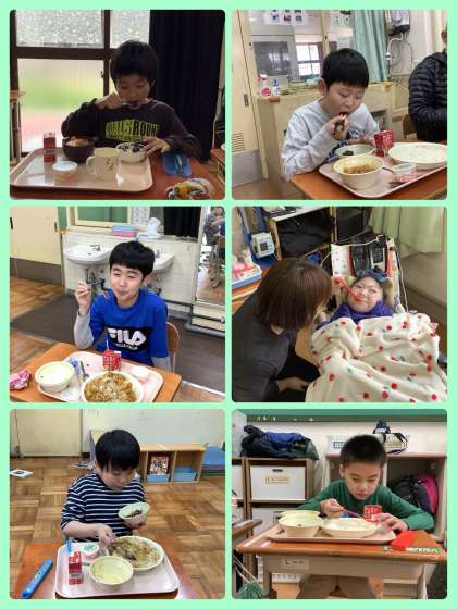 みんな楽しみにしていた給食が始まりました。給食の用意も協力してやっています。とっても美味しそうに食べていました。