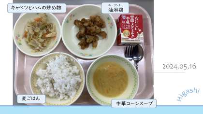 油淋鶏は中国料理のひとつです。「油淋」は油をかけるという意味ですが、給食ではたくさんの鶏肉を調理するので、衣をつけて油で揚げています。揚げた鶏肉に、ねぎの香りやしょうがのきいたさっぱりした香味ソースをかけて仕上げました。
