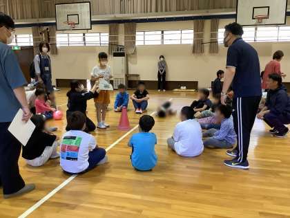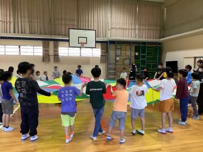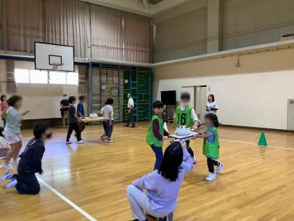 4、5年生が秋の合同運動会に向けて、山科支部の育成学級の友だちと一緒に活動しました。初めにみんなでダンスをした後、身体を動かすゲームをいくつかして、みんなで楽しみました。「おみこしリレー」では、おみこしに載ったケーキを落とさないように友だちと協力して運びました。「ゴロゴロドカン」では、音が鳴ったときにボールを持っていた人が自己紹介です。みんなの前でしっかりと自己紹介できました。最後はみんなでバルーンをしました。音楽に合わせてバルーンを動かし、風を感じたり、膨らんだバルーンに歓声をあげたりしていました。たくさんの友だちと仲良くなれましたね。