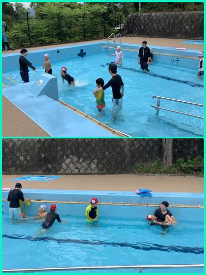 水泳学習が始まりました。久しぶりの水泳学習に、水の感触を全身で感じ、楽しそうな表情をして活動していました。
