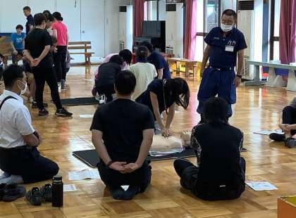 胸骨圧迫による心肺蘇生法やAEDを使っての実践、気道の異物除去、止血の方法などを学びました。山科消防署の方々の熱心な指導のもと、参加した教職員は真剣な表情で講習を受け、多くのことを学び、グループで実技を行ないました。お忙しい中講習をしていただき、ありがとうございました。
