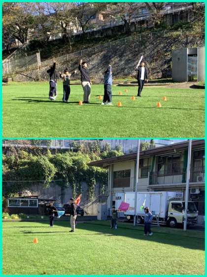 学習発表会の練習をしていました。指導者の説明を聞いたりやり方を見たりして、グループでの動きや旗の振り方を覚えて活動していました。