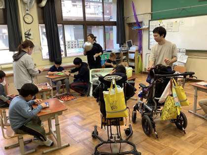 さまざまな素材に触れて感触を確かめることで、五感を育み、たくさんのことに好奇心を持てるよう、感触遊びの学習をしています。今日はスライム作りをしていました。作り方を聞いたり見たりして、材料を混ぜてそれぞれのスライムを作っていました。