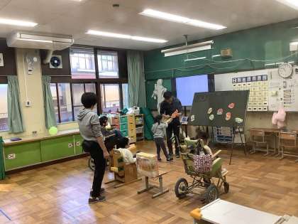 絵カードに合わせて楽器でリズムをとって活動していました。絵カードをボードに貼り、描かれている物の名前に合わせて、楽器を楽しそうに鳴らしていました。