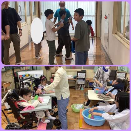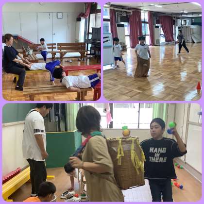 本日から縦割りのユニット学習が始まりました。教材を通して友だちとやりとりをしたり、様々な道具を使ってたくさん身体を動かしたりしていました。