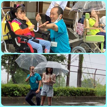 ユニットの様子です。「季節を感じよう」という学習をしていました。6月なので、みんなで雨に関する歌を歌ったり聞いたりしました。今日は、雨が降っていたので、実際に外に出て雨の中、傘を差しました。雨音や水溜まりの様子、傘に当たる雨の音を感じていました。
