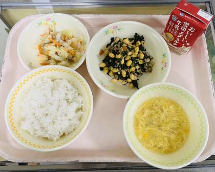【みそ」は、大豆に米・麦などの穀物と、塩、麹を加えて発酵させて作る発酵食品です。給食では、「豆みそ」「信州みそ」「赤みそ」「白みそ」の4種類を使っています。汁物だけでなく、いろいろな料理に調味料として使うことができます。今日の『豚肉と大豆のみそ炒め』には、「赤みそ」を使いました。