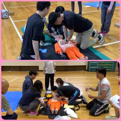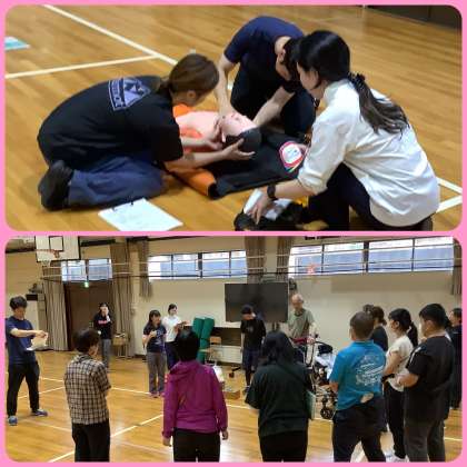 水泳学習を安全行うために、緊急事態を想定した救急シミュレーションの訓練をしました。雨天のため、体育館内に敷いたブルーシートをプールに見立て、入水体制ごとに、緊急時の体制や役割分担、心肺蘇生法を確かめながら行いました。