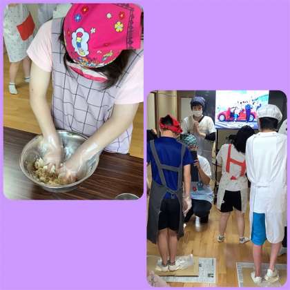 2年生の調理実習の様子です。メニューは「ぶっかけうどん」でした。小麦粉に塩水を3回に分けて入れ、よく混ぜ合わせていました。なかなか、一つの塊にならず、力を込めてこね、さらに、生地をビニール袋に入れ、足でよく踏みさらにこねていました。順番に、こねたり切ったりする姿やクラスメイトを手伝う姿が見られました。