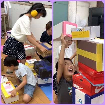 箱積みをしているユニットでは、倒れないように自分たちの背丈よりも高く積んだり、箱の色を見て、色別に重ねたりしていました。バランスを考えながら積み上げていました。