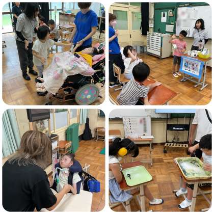 小学部の児童は、登校時から元気に挨拶をしたり、思いっきり身体を動かしたりしています。それぞれの学習活動では、興味関心のあることに自ら関わっていこうとする姿が見られました。食い入るように教材を見聞きしたり、先生の動きの真似をしたり、友だちと言葉やカードを使いやりとりや笑顔で応えたりしていました。
