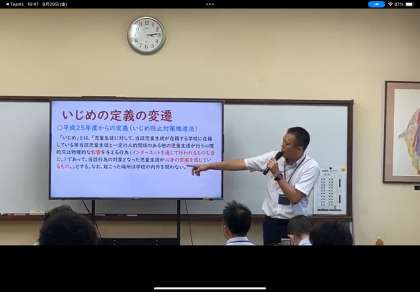 本日、教育委員会生徒指導課 指導主事 四方亮宏様を講師にお招きし、本校教職員を対象に「いじめの対応について」というテーマで、ご講義いただきました。現在のいじめの定義についてや、未然防止やいじめを見逃さずに対応していくことの大切さ等の内容でお話しいただきました。お話しいただいたことを今後に生かしていきたいと思います。
