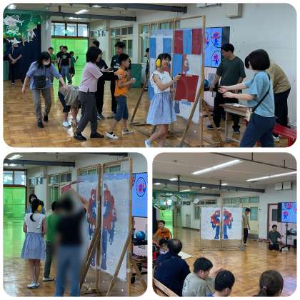 6年生の修学旅行報告会の様子です。4、5年生に向けて修学旅行の報告会を実施しました。海遊館と大阪、関西万博に行ったことを報告したあとには、それぞれ「魚にエサをあげようゲーム」と「万博の公式キャラクターを探そうゲーム」をみんなでしました。エサに見立てたカラーボールを様々な魚が張り付いた網に投げ入れたり、キャラクターを貼ったボールを探して楽しい時間を過ごしました。最後に、修学旅行の感想を発表し、報告会を終えました。