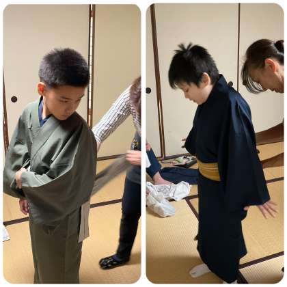 本日から5年生の宿泊学習です。午後から生活学習棟に集合し「結団式」を行い、スケジュールの確認をしました。その後、みんなが楽しみにしていた「きもの着付け体験」でした。講師の方に「よろしくお願いします。」と元気よく挨拶をし、きものを着付けてもらいました。着付けてもらっている間、終始笑顔の児童もいました。着付けていただいた後は、校内を歩いてたくさんの先生にお披露目をしました。