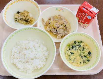 今日の汁物は、優しい味わいの「かきたま汁」です。卵のふんわりとした食感が、心も体も温まる一品です。卵を入れる前に、水で溶いたかたくり粉を加えることで、汁にとろみがつき、卵がふんわりと広がります。このひと工夫で、口当たりもやさしく、よりおいしく仕上がります。卵の黄色、小松菜の緑色が彩りよく、見た目でも楽しんでもらうため、小松菜は最後に入れます。小松菜は、ビタミンや鉄分が豊富で、成長期の体作りにぴったりの野菜です。たまねぎも加え、たまねぎの甘みが全体の味をやさしくまとめてくれています。