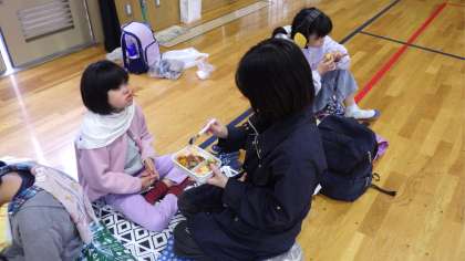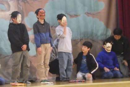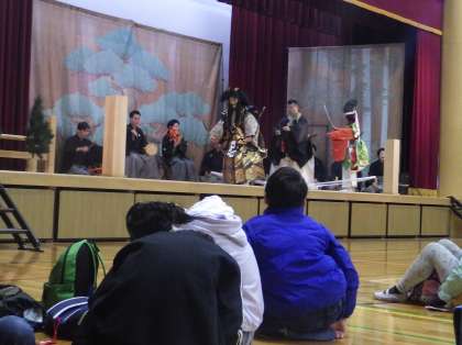 安朱小学校で行われた能楽体験に行きました。最初に、能楽は650年続く日本の伝統芸能という話を聞きました。話の途中で楽器を演奏されたり、独特の言い回しで謡われたりするのを聴くと、舞台の方に目が釘付けになる子どもたちでした。実際に子どもたちが楽器を演奏させてもらったり、面をかぶらせてもらったりする貴重な体験もできました。最後は『船弁慶』という演目を観賞し、能楽に触れることができる機会になりました。楽しみにしていたお弁当も、みんなで体育館で美味しく食べました。