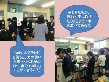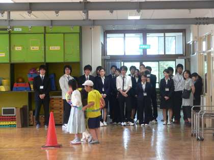 6月12日(水)今年度2回目の介護等体験があり、今回は仏教大学から35名の学生さんを迎えました。本校の取組の研修の後の、校内見学では、学生さんから様々な質問が出ました。午後は各学部、学年に入り、子どもたちととすぐに打ち解け笑顔で活動をしました。明日も一日、子どもたちと活動をします。