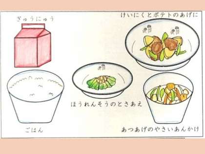 ごはん・牛乳・鶏肉とポテトの揚げ煮・厚揚げの野菜あんかけ・ほうれん草の土佐和え