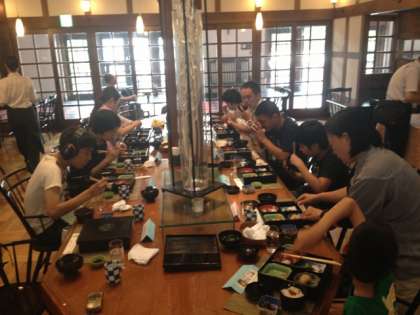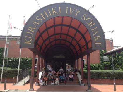 7月3日(水)倉敷アイビースクエアで集合写真を撮りました。日差しも見えています。昼食はアイビースクエアのレストランです。お腹いっぱいになって、さあ、次の活動に向かいます。
