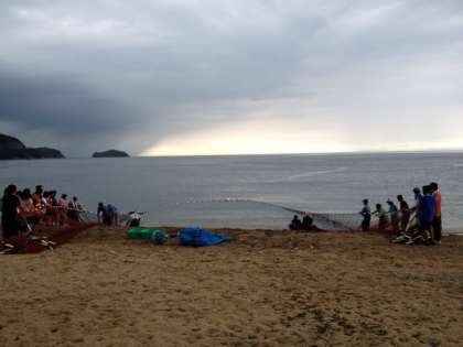 7月4日(木)中学部3年 地引網体験、奇跡的に決行できました!途中雨が降りだしましたか、みんなで力を合わせて網を引きました。