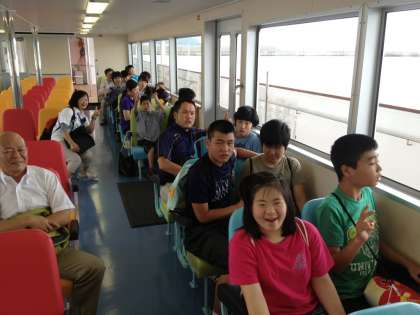 7月5日(金)中学部3年生 観潮船の前で記念撮影!鳴門うずしお観潮船に乗り込みました。みんなワクワクです。うずしおは見えるかな?