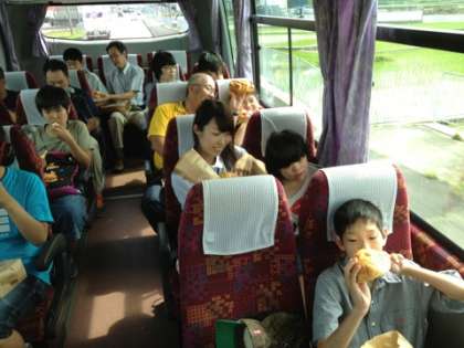 7月5日(金)中学部3年生 イングランドエリアの「ひつじのくに」で餌やり体験をしたり、グループ別活動でソフトクリームを食べたり土産物を買ったりしている間に、パンが焼きあがりました!帰りのバスの中で、おやつタイムです!いっぱい食べました。満足〜!これから京都駅に向かいます。
