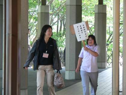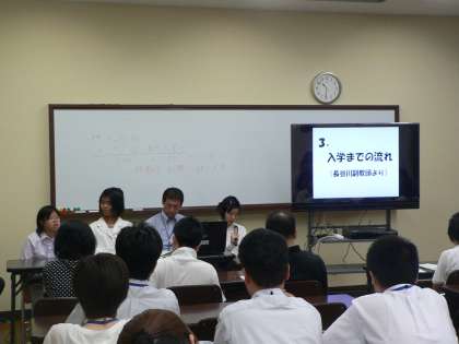 7月10日(水)高等部見学・説明会2回目が開催されました。前回同様、生徒会本部役員や高等部生徒が案内のプラカードを持ち、受付・会議室へ案内したり、教育課程等の説明の後、高等部の生活を説明をしました。授業見学にも同行し、最後まで、担当の役割を担うことができました。