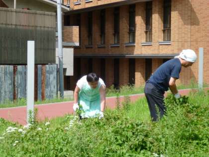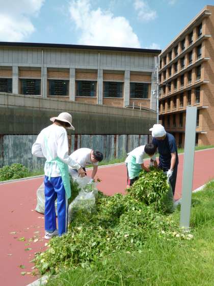 9月11日(水)高等部ワーク地域実践ユニットで京都橘大学へ行き、芝生地の草抜きの作業を担当しました。残暑厳しい日でしたが、ゴミ袋5袋分の草を抜くことができました。通りかかった職員の方々から「御苦労さま」「ありがとう」と声を掛けてもらい、生徒たちも「こんにちは」と挨拶をすることができました。