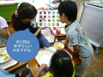 教室ではたくさんの豆の種類を標本で紹介すると,「いろんな音がするかも?!」「今日の豆はこれ?」と興味をもっているようでした。