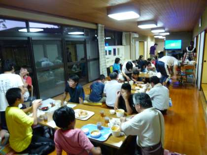 9月12日(木)中学部1年生宿泊学習 夕食が始まりました。各自好みのスパゲッティと、スープなどのメニューです。学年の友だちや先生方と集まっての夕食はとても賑やかです。お腹いっぱいになったでしょうね。