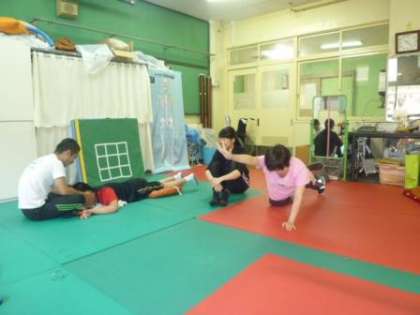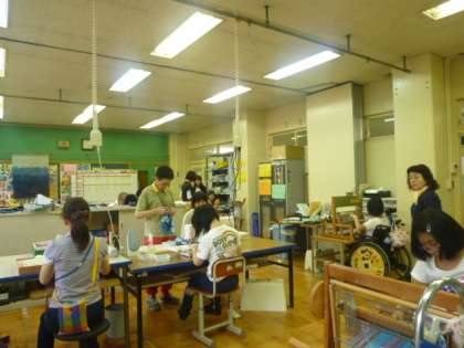 高等部は,個別課題学習や身体の学習の後,本日は『ワークスタデイ』のようすを参観していただきました。写真は,身体の学習の様子と陶芸班と染織デザイン班での学習のようすです。陶芸班では,角皿作りに向けての製作やは箸置き等の製作を作業目標を決めて行いました。染織デザイン班では,藍染めや草木染めをしたものでの作品作りやさをり織り等任された作業を集中して取り組んでいました。